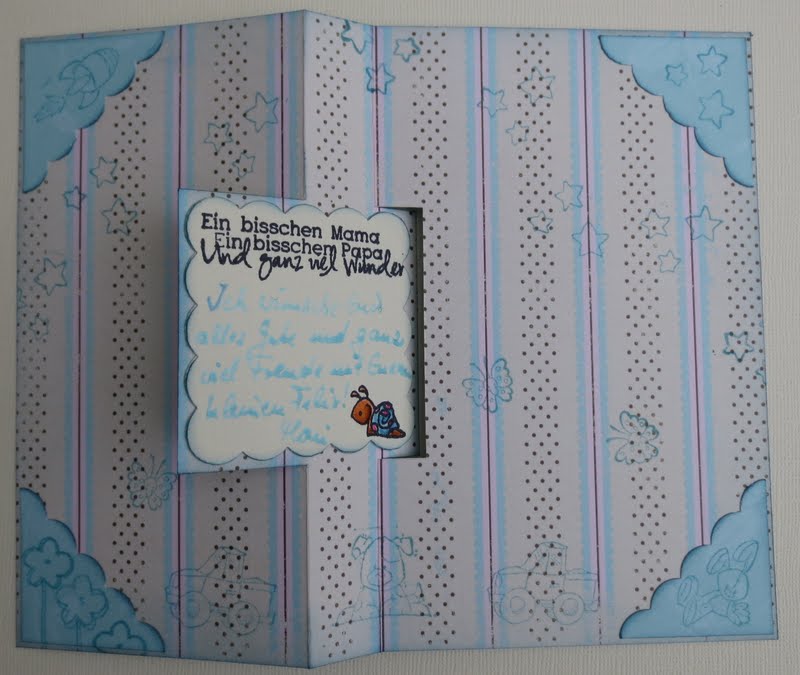 Die Karte nach 7,5 und 9,5 cm falzen. Den Flügel habe ich so groß geschnitten, dass das Quadrat meines großen Scallop-Stanzers drauf passt. Dabei wird aus dem linken, 7,5 cm breiten Kartenstück die Hälfte des Quadrates eingeschnitten, die andere Hälfte liegt auf dem 2 cm breiten Streifen (hier wird nicht geschnitten) und der Rest auf dem rechten Kartenstück. Das Fenster muss nicht quadratisch oder eckig sein, wichtig ist nur, dass links des ersten Falzes die Hälfte davon eingschnitten wird.